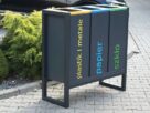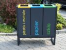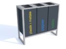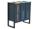 Kosz do segregacji TEMIDA  III 60l  na podwyższeniu składający się z 3 pojemników do segregacji odpadów, każdy o pojemności 60l .