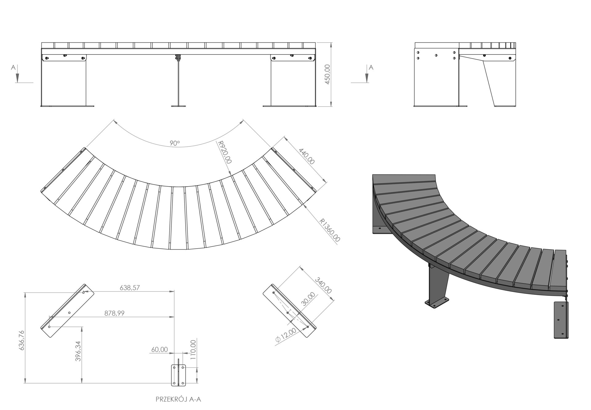 - 6 ławek o promieniu 60 stopni tworzy okrąg o średnicy wewnętrznej 298cm i średnicy zewnętrznej 378cm. Rysunek ławki – POBIERZ