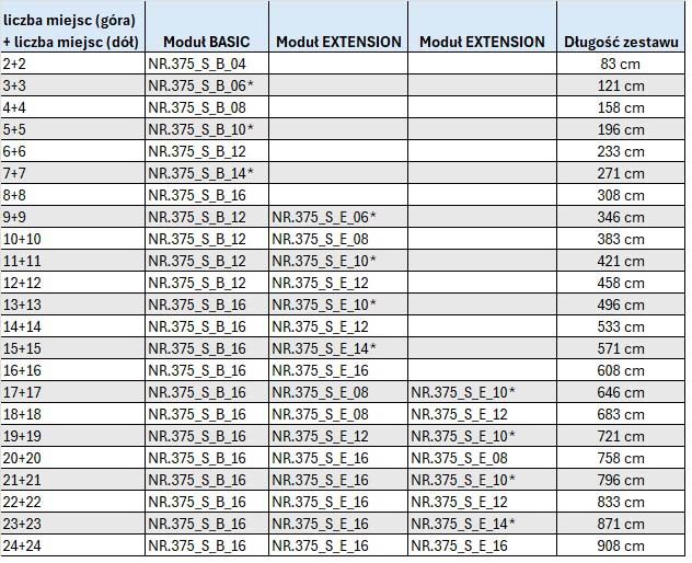 W wersji standardowej stojak o rozstawie między stanowiskami 375mm. Opcjonalnie możliwość zastosowania większych rozstawów 400, 450 lub 500mm