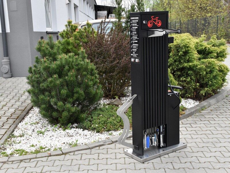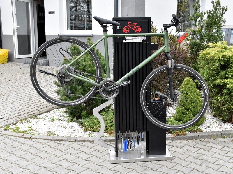 Samoobsługowa stacja naprawcza dla rowerów wyposażona w szereg narzędzi niezbędnych do wykonania naprawy naszych jednośladów. W zależności od wybranej wersji stacja naprawy rowerów może być wykonana w wersji podstawowej w zestaw narzędzi naprawczych lub opcjonalnie wyposażona w pompkę nożną, kompresor elektryczny (230V), daszek lub oświetlenie led.