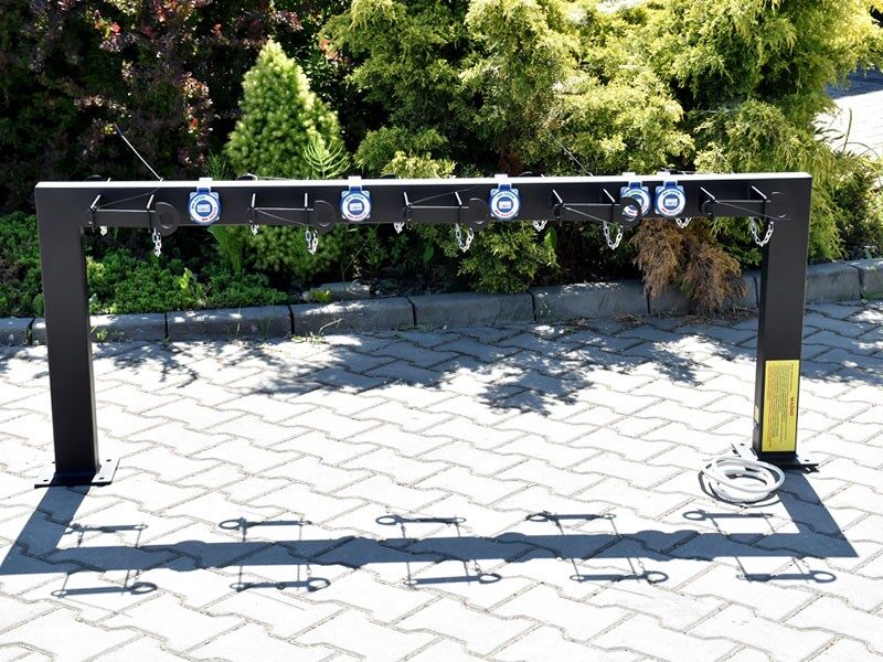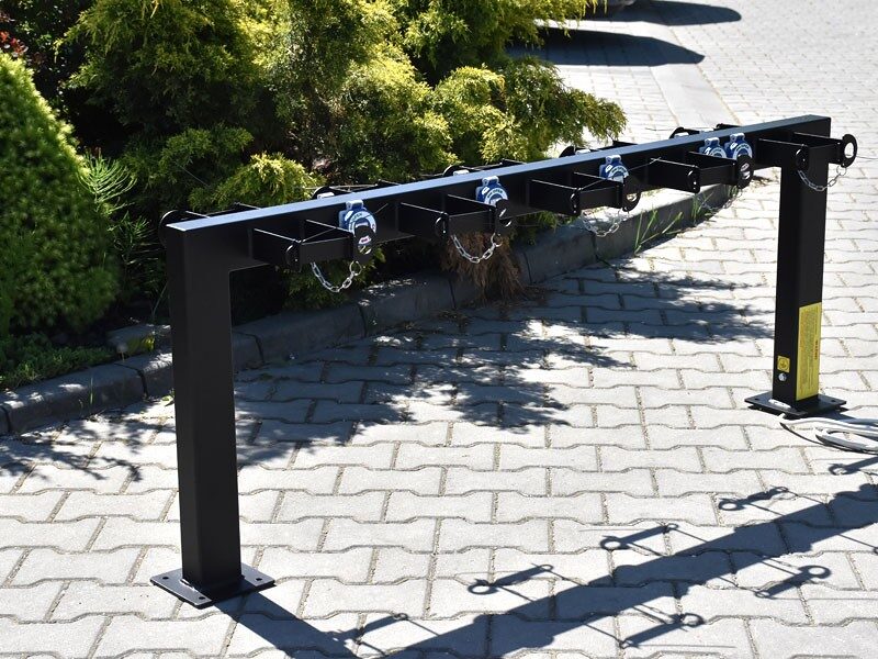 Stojak na hulajnogi elektryczne dwustronny to przemyślana konstrukcja zaprojektowana tak aby pomieścić 10 hulajnóg po obu stronach.