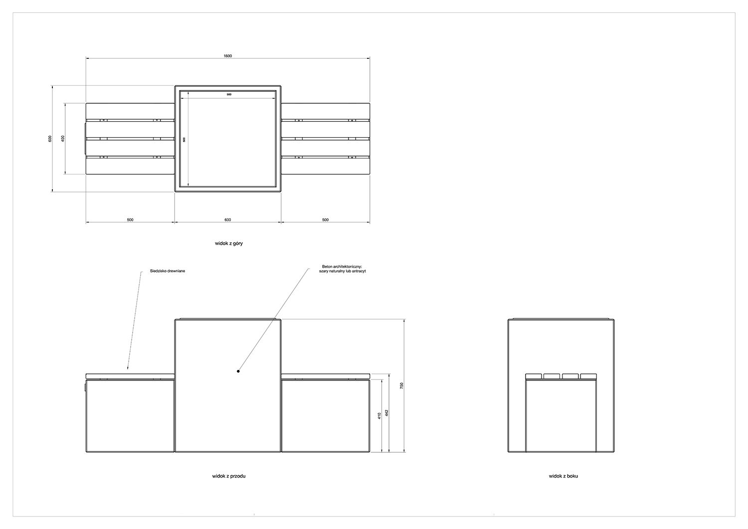 Konstrukcja wykonana w całości z betonu architektonicznego. Do wyboru kolory betonu: szary, antracyt lub biały. Beton barwiony w masie.